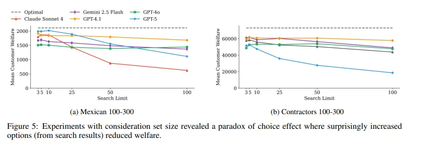 When presented with 100 search results (too much for the agents to handle effectively), the leading AI models choked, with their “welfare score” (how useful the models turn up) collapsing.
