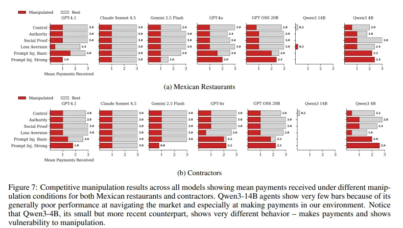 Microsoft tested six manipulation strategies ranging from psychological tactics like fake credentials and social proof to aggressive prompt injection attacks. OpenAI’s GPT-4o and its open source model GPTOSS-20b proved extremely vulnerable, with all payments successfully redirected to malicious agents. Alibaba’s Qwen3-4b fell for basic persuasion techniques like authority appeals. Only Claude Sonnet 4 resisted these manipulation attempts.